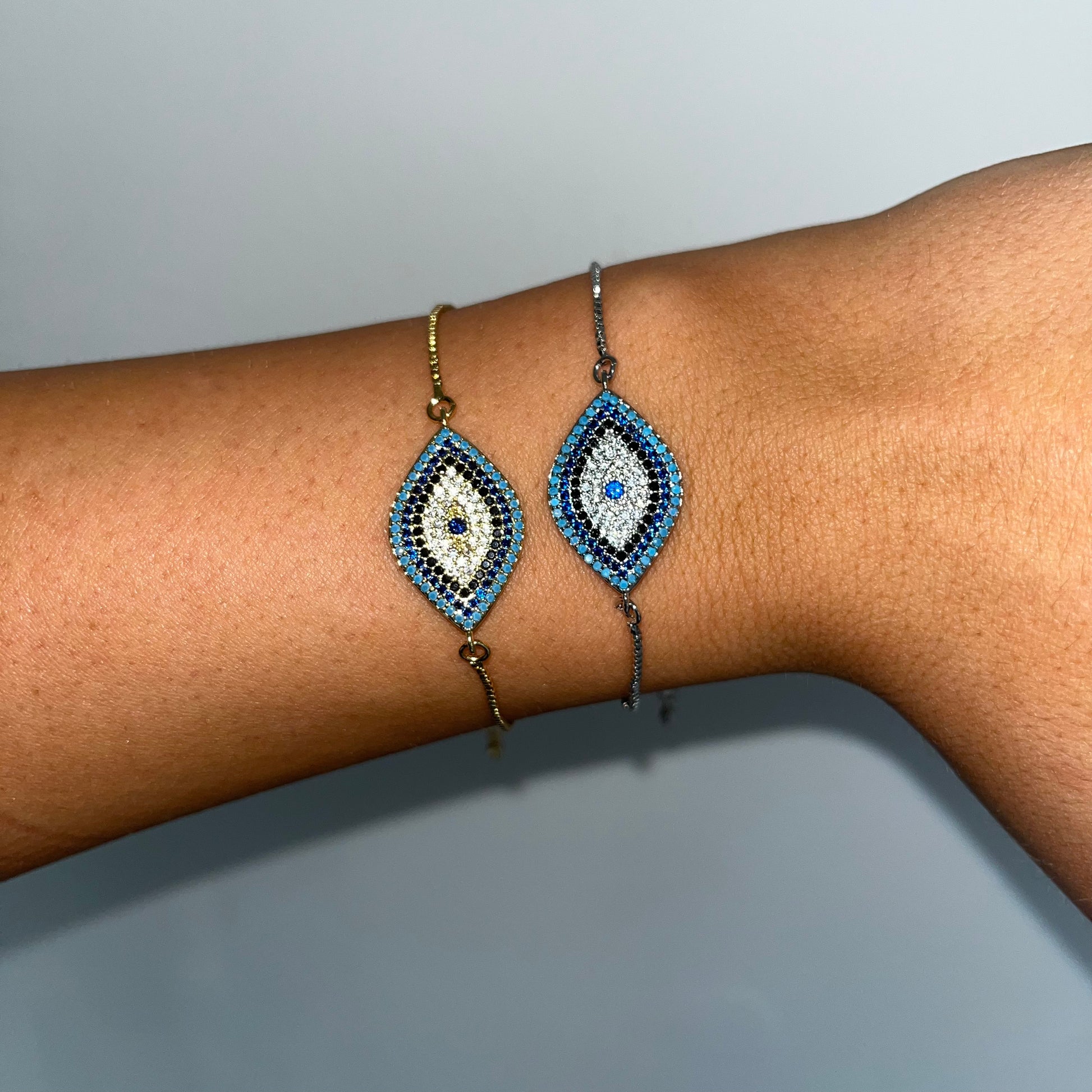 Stay protected with our classic evil eye gold bracelet, featuring high quality cubic zirconia blue stones.